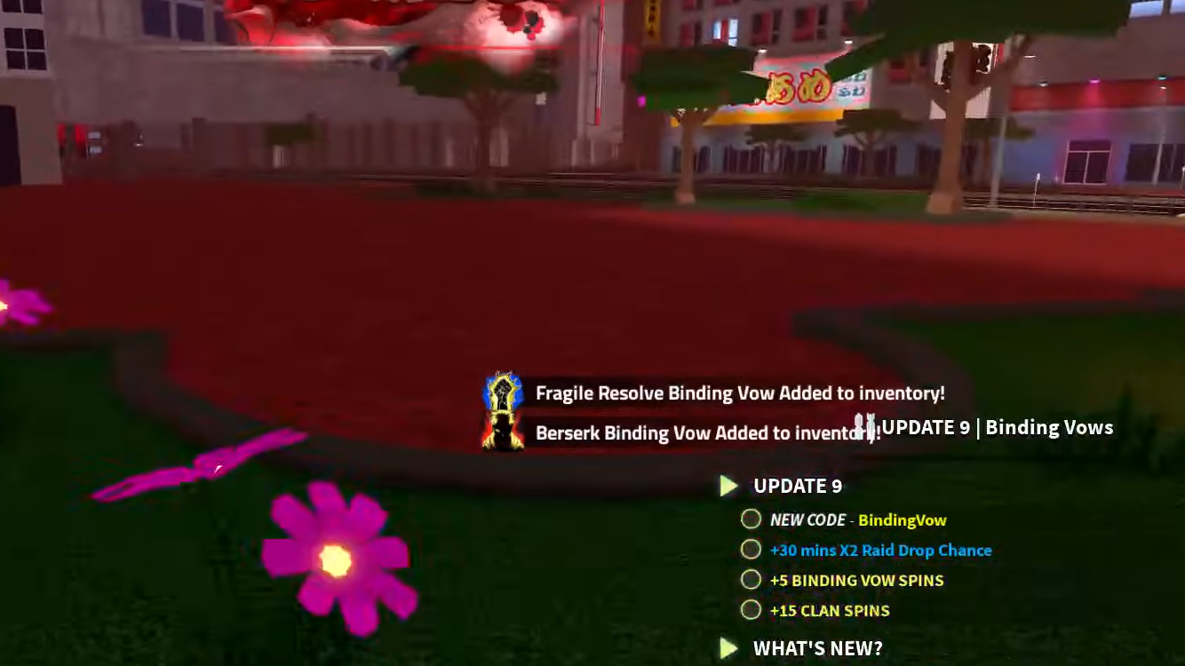 Binding Vow Spins are the primary bottleneck. You can earn free spins by redeeming Kaizen codes — the code BindingVow specifically grants 5 Binding Vow Spins along with 15 Clan Spins and a 15-minute 2x Raid Drop Chance boost. Additional codes rotate regularly, so check the settings menu (gear icon, top-left corner) to redeem them as they become available.