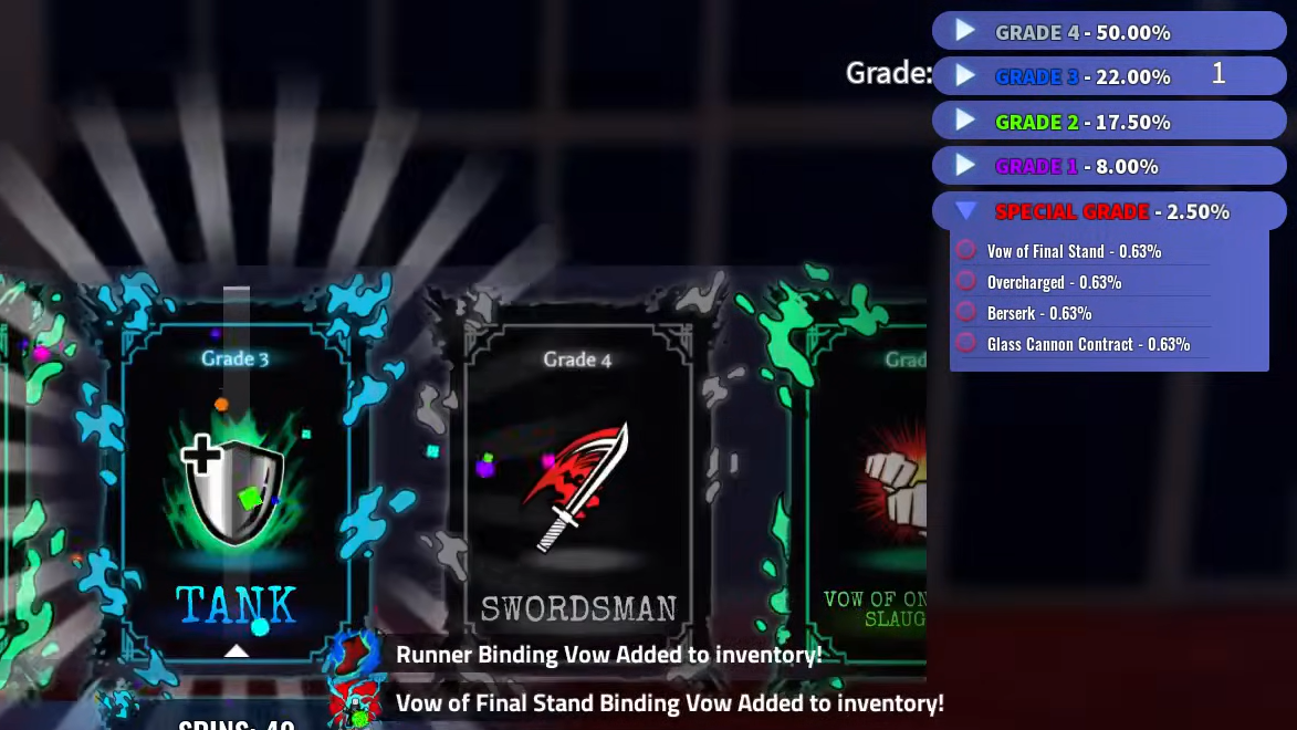 Special Grade vows have a 2.5% drop rate from the Binding Vow spin. They deliver the most dramatic effects in the game but come with steep penalties, especially to defense.