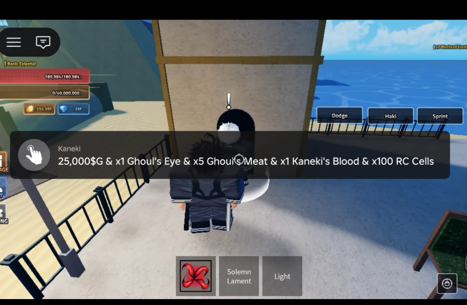 Step 3: Talk to the Summon Kaneki NPC and confirm the prompt. He will consume one Kaneki’s Blood and spawn the Kaneki Boss in the center of the hilltop.