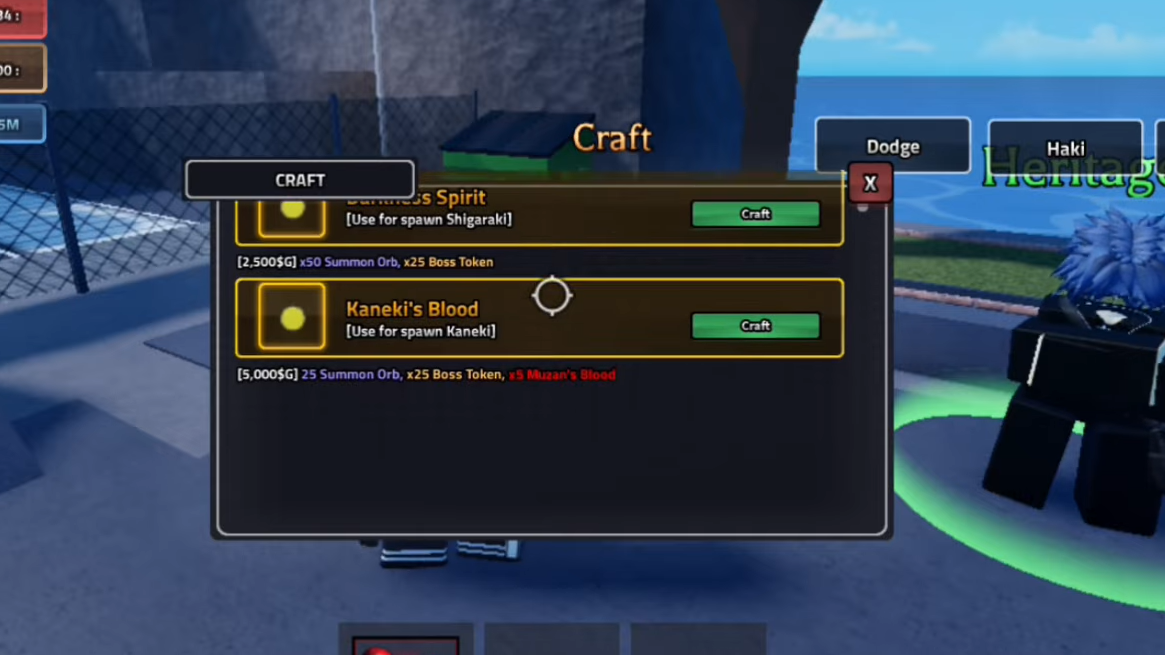 Step 3: Once you have at least 5 Muzan’s Blood and 25 Boss Tokens, craft one Kaneki’s Blood in Rogue Town to test the Kaneki Boss and gauge its difficulty. If the fight feels manageable, scale up and craft multiple Bloods.