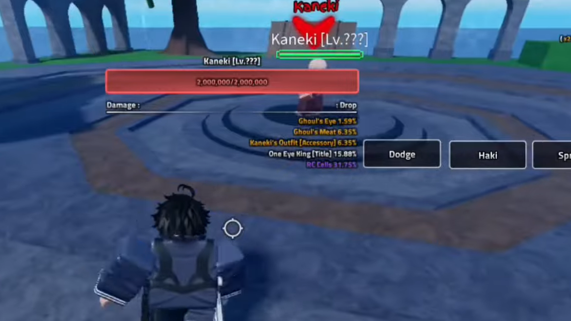 The Kaneki Boss spawns with roughly 2,000,000 HP when everything works correctly. In crowded public servers, the boss can appear with some health already chipped down if people are mid-fight or if health sync is off; private servers tend to give the clean, full-HP encounter.