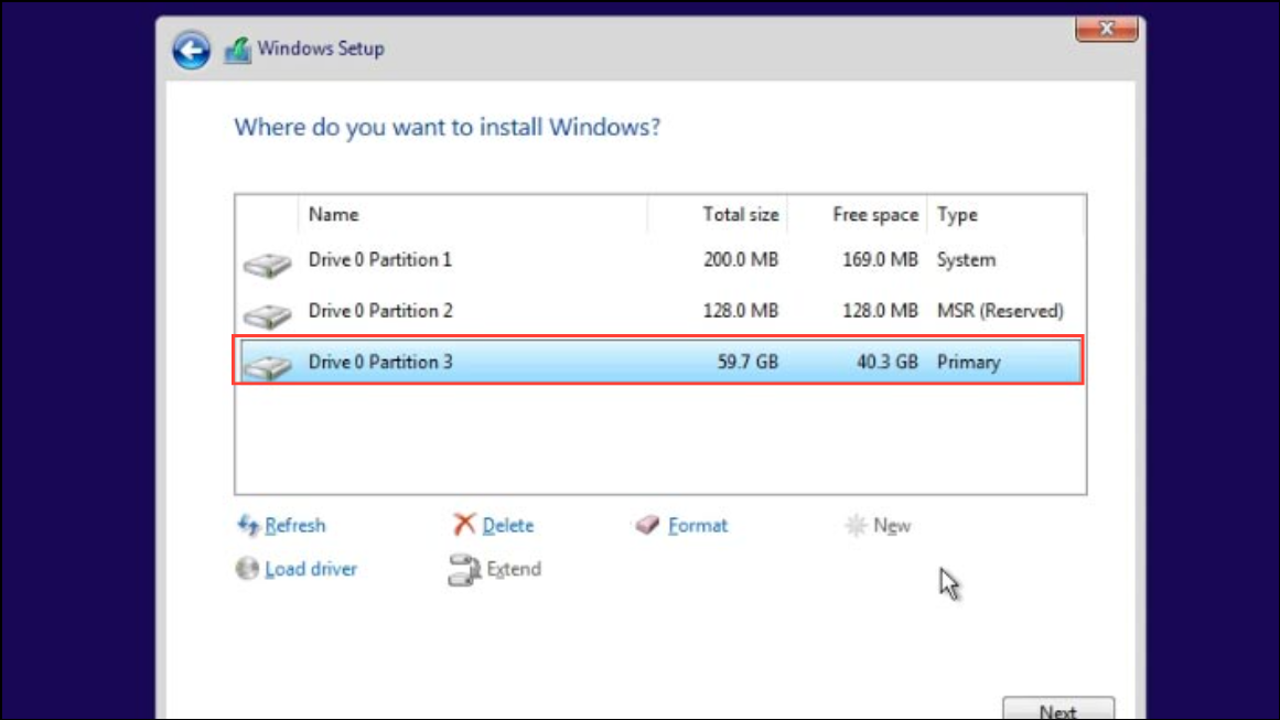 Step 3: Click Next to continue. Windows will install on the selected partition and will not touch files on other drives or partitions. Only the chosen partition is affected by the installation process.