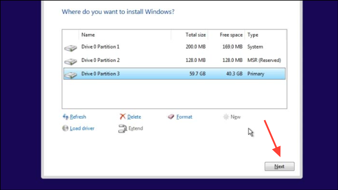 Step 1: Start the Windows 11 installation from bootable media. When you reach the "Where do you want to install Windows?" screen, you will see a list of all available drives and partitions.