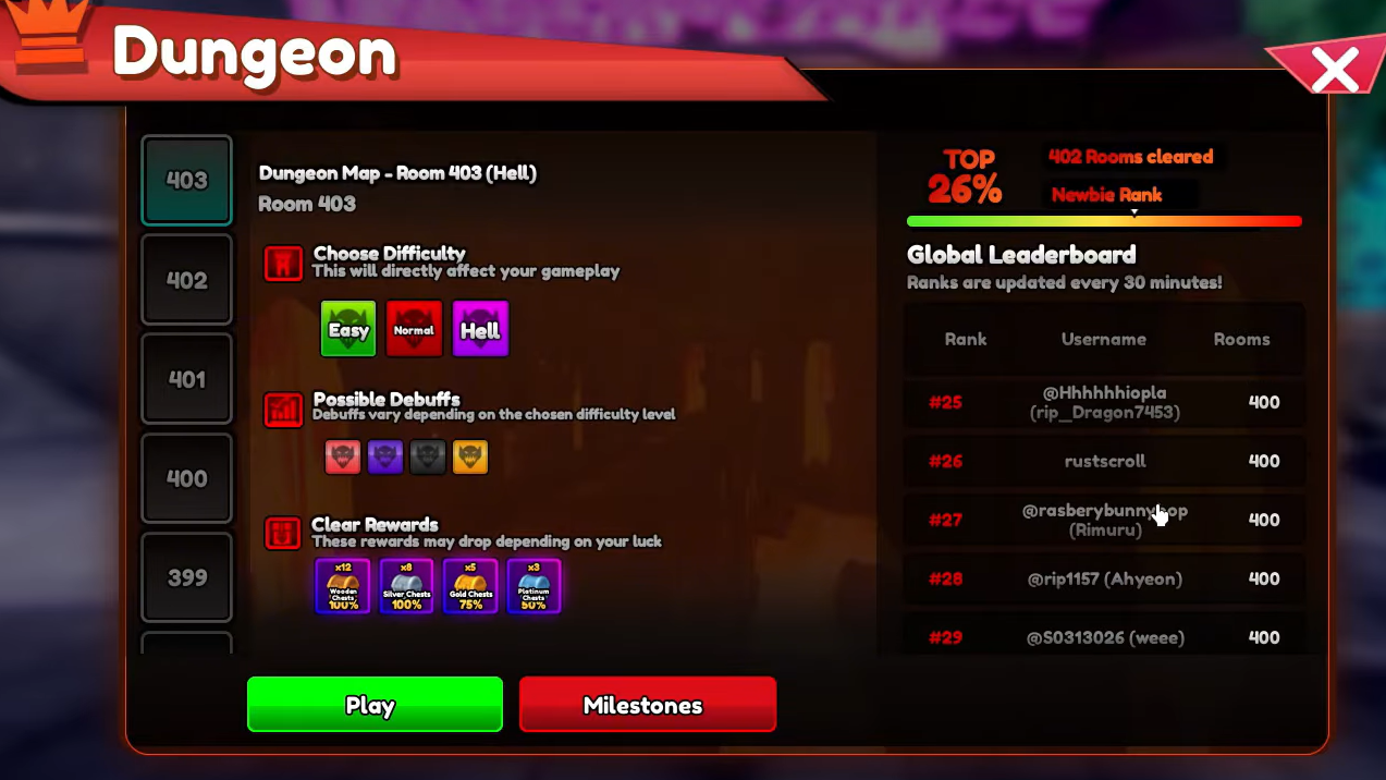 Platinum chests give you the most realistic shot, and you earn those by hitting dungeon milestones. Reaching room 50 in hell mode awards two platinum chests; reaching room 100 awards four. The more rooms you clear, the more chests you accumulate across all tiers. Codes that reward golden chests can also contain Kirito, so always redeem active codes before opening anything.