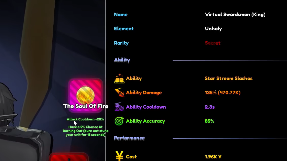 Once you have both the Virtual Swordsman unit and his evolution item, head to the upgrade zone and evolve him. The evolved form is called Virtual Swordsman Stardust, classified as a secret-tier unit. The evolution itself is instant — select the unit, confirm you have the evo material, and it transforms immediately.