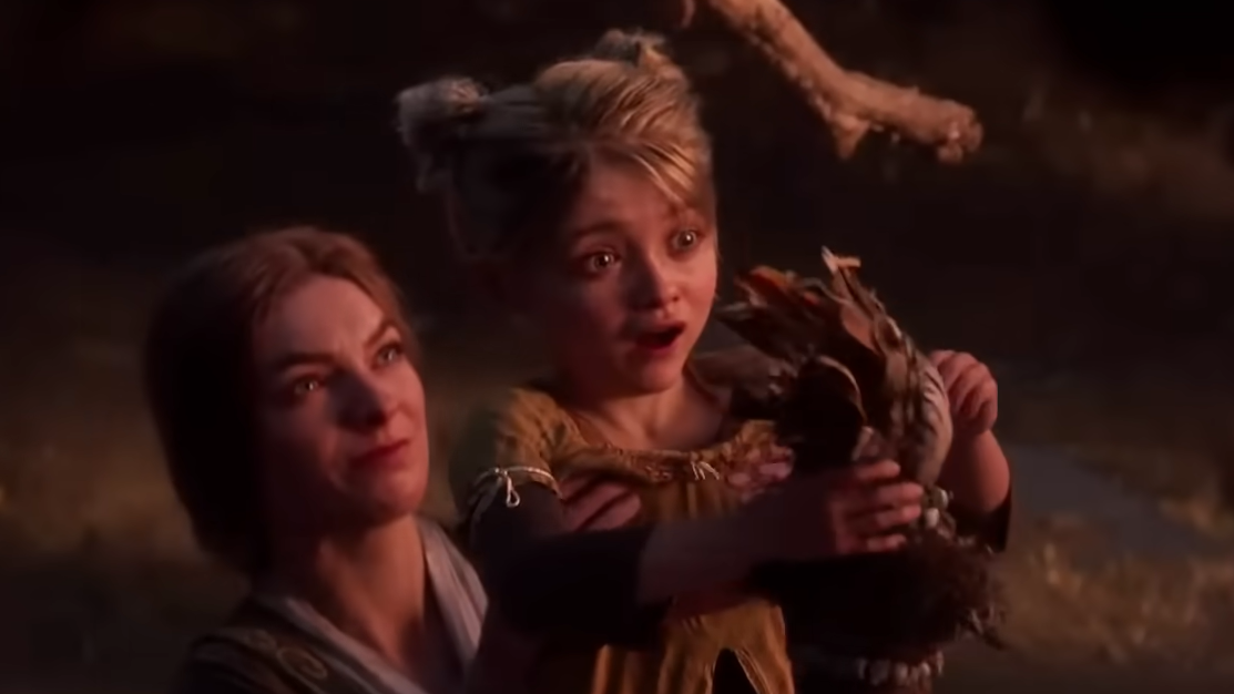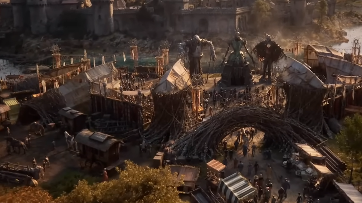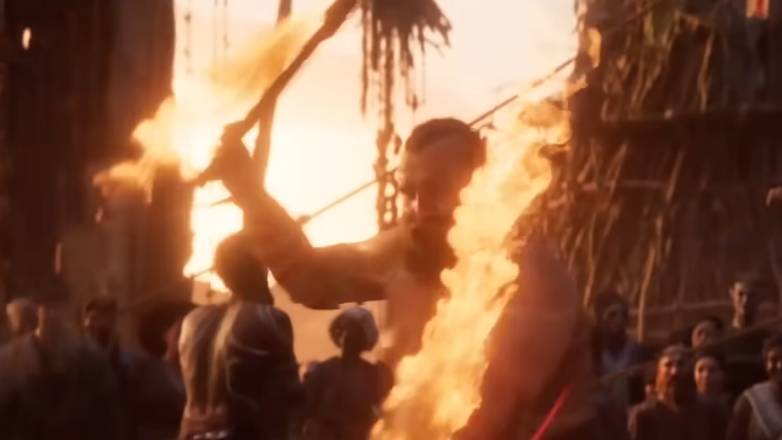 The trailer frames Divinity as a grim, bodily-horror-inflected fantasy story. The central sequence depicts a village celebration that includes human sacrifice, followed by an outbreak-like metamorphosis where the victim’s body changes violently and spreads something unnatural into the environment.