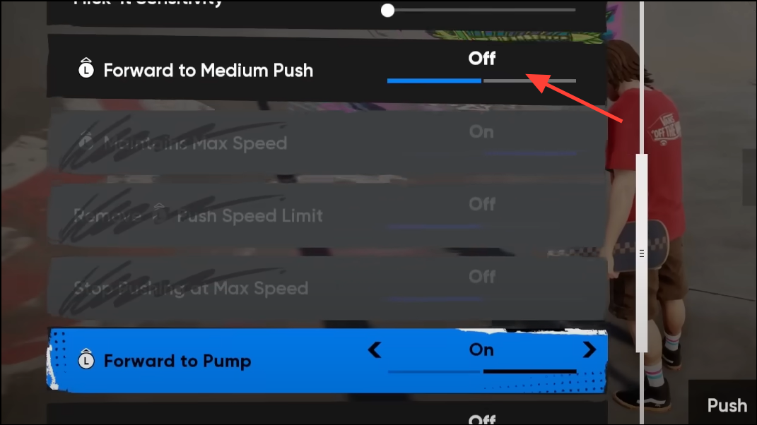 Step 3: Disable “Forward to push” if you use a button to push. When both are on, a forward press tends to trigger a push instead of a pump, which prevents speed gain at the ramp.