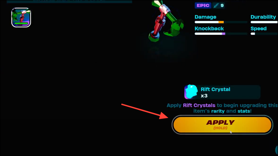 Step 4: Interact with the Forge and apply 3 Rift Crystals to an Epic-rarity weapon to make it Rifted.