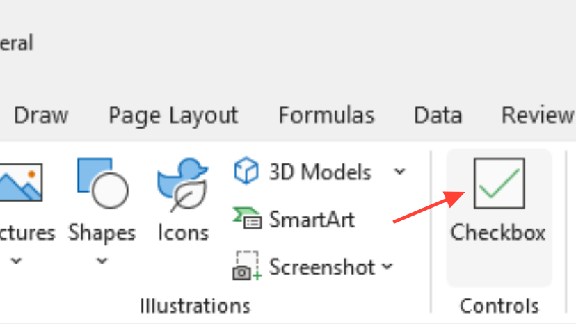 Step 3: On the Insert tab, click Checkbox. Excel will place one in‑cell checkbox per selected cell. No linked cell is required—the value lives in the same cell.