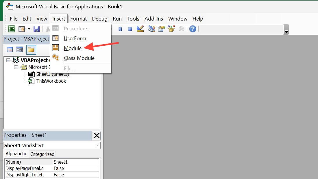 Step 2: Insert a standard module via Insert > Module. This keeps the macro reusable across sheets.