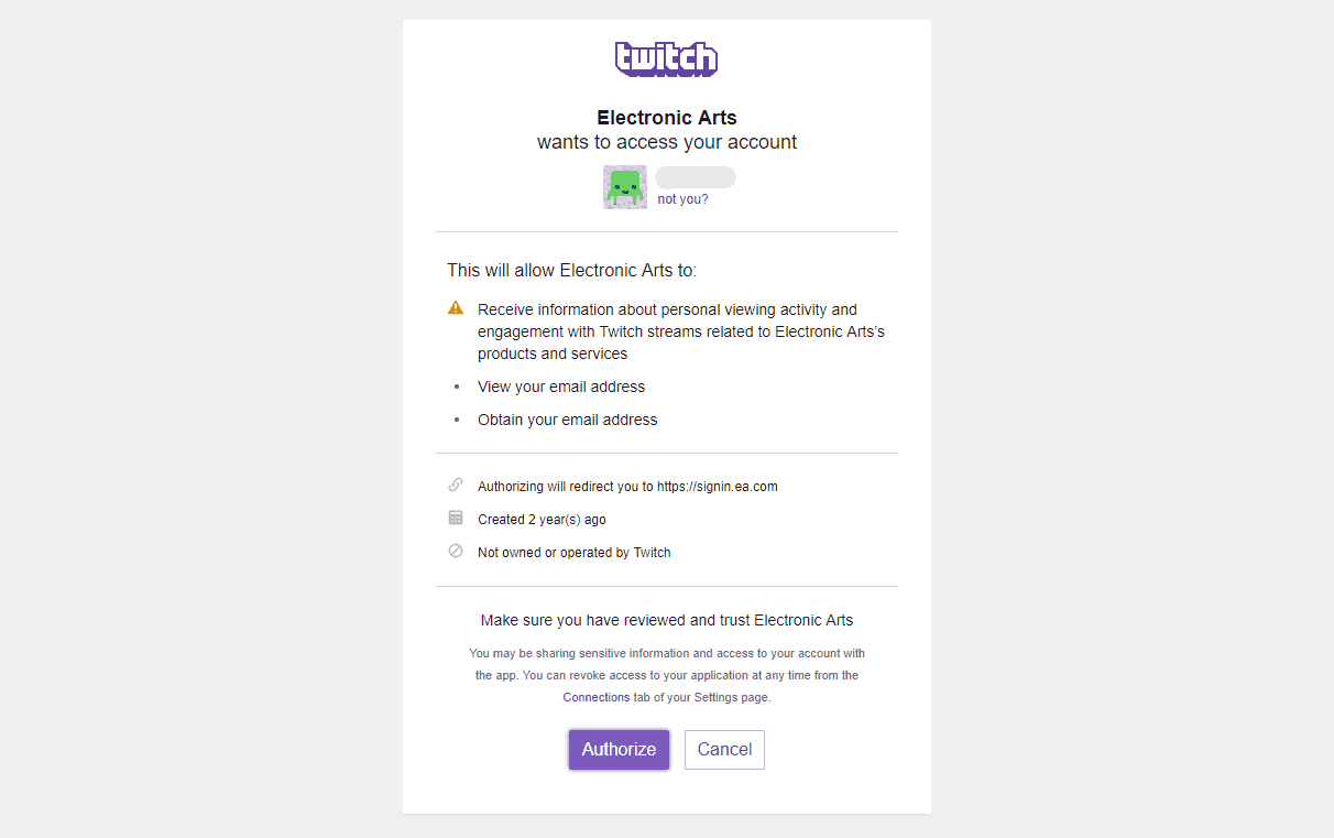 - You’ll get a screen asking for permission to authorize EA to link to your Twitch account. To continue, click on the Authorize button.