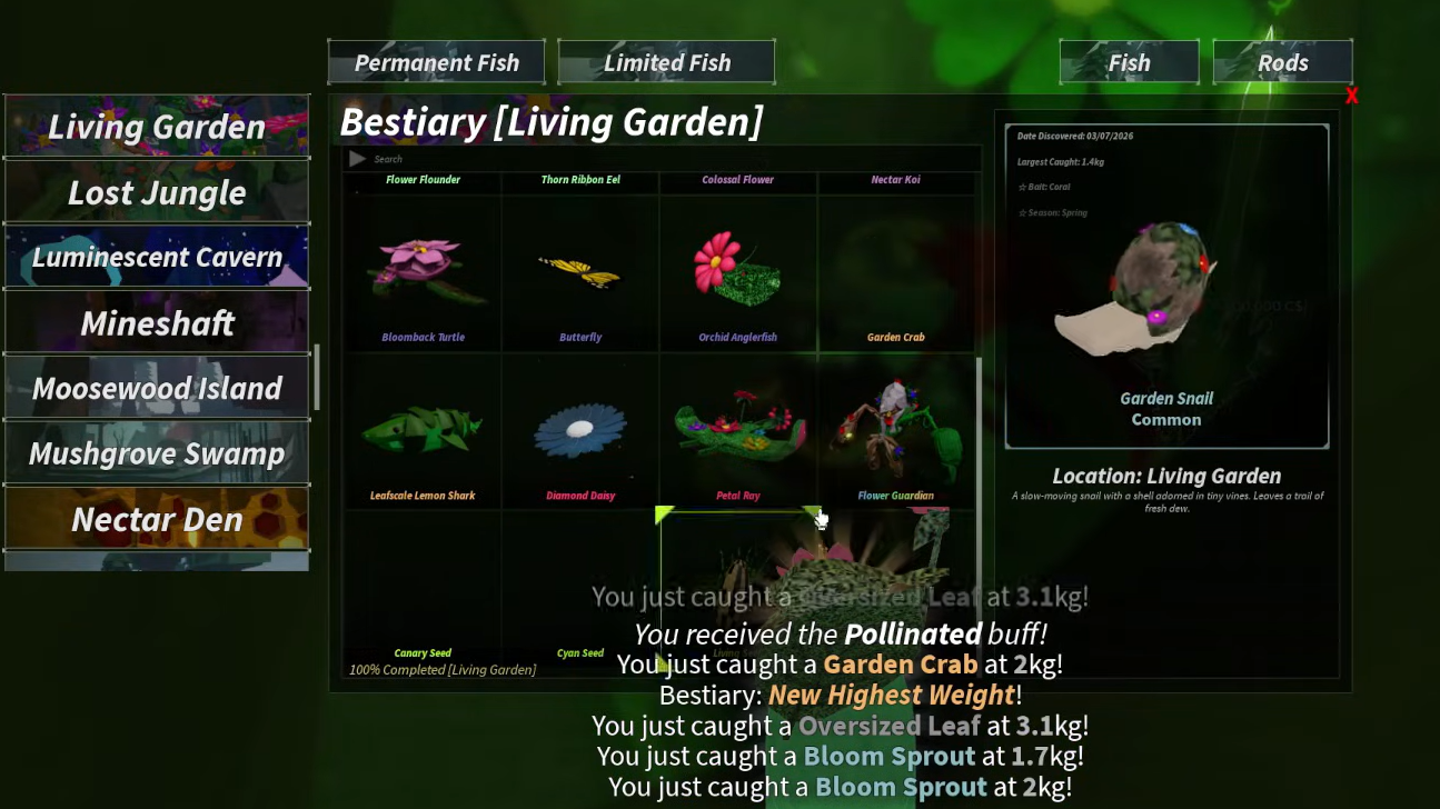 The shortest route is straightforward. Unlock the Toxic-Proof Raft, enter the Living Garden, clear the flower-based seed entries, set crab cages early, fish for the remaining pool under the right weather and season, and stay until Flower Guardian appears. Once all 20 main entries are filled, the Living Garden bestiary is finished and the Verdant Oath Rod unlock follows.