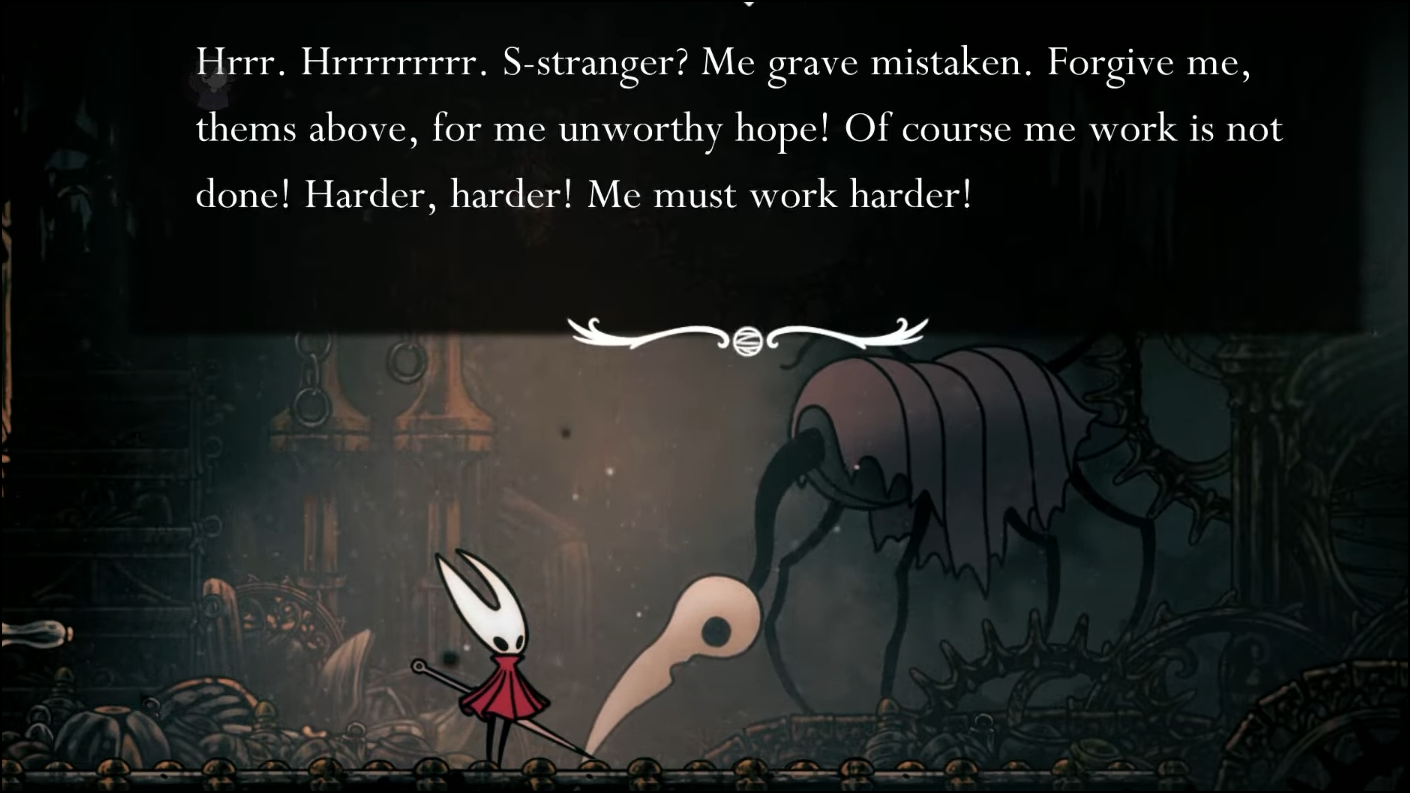 Loam (male) is encountered mid-Underworks, running a large treadmill that is visibly connected to gears and cogs throughout the area. He believes the distant Citadel is watching and rewarding diligence, and he interprets any pause as failure. Speak to him and he’ll briefly break pace to address Hornet, then return to running almost immediately.