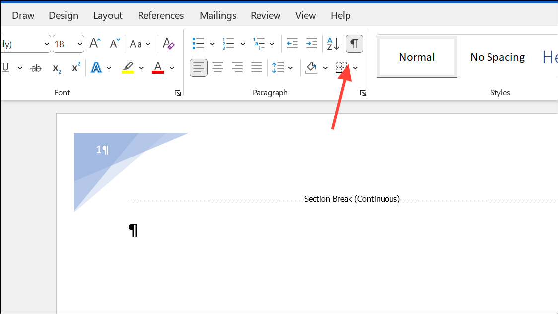 Step 4: To minimize the appearance of the section break, switch to the Home tab, then click the Show/Hide ¶ button in the Paragraph group. This reveals non-printing characters, including section breaks. Select the section break and set its font size to 1 in the font size box, then press Enter to shrink it. Click the Show/Hide ¶ button again to hide formatting marks.