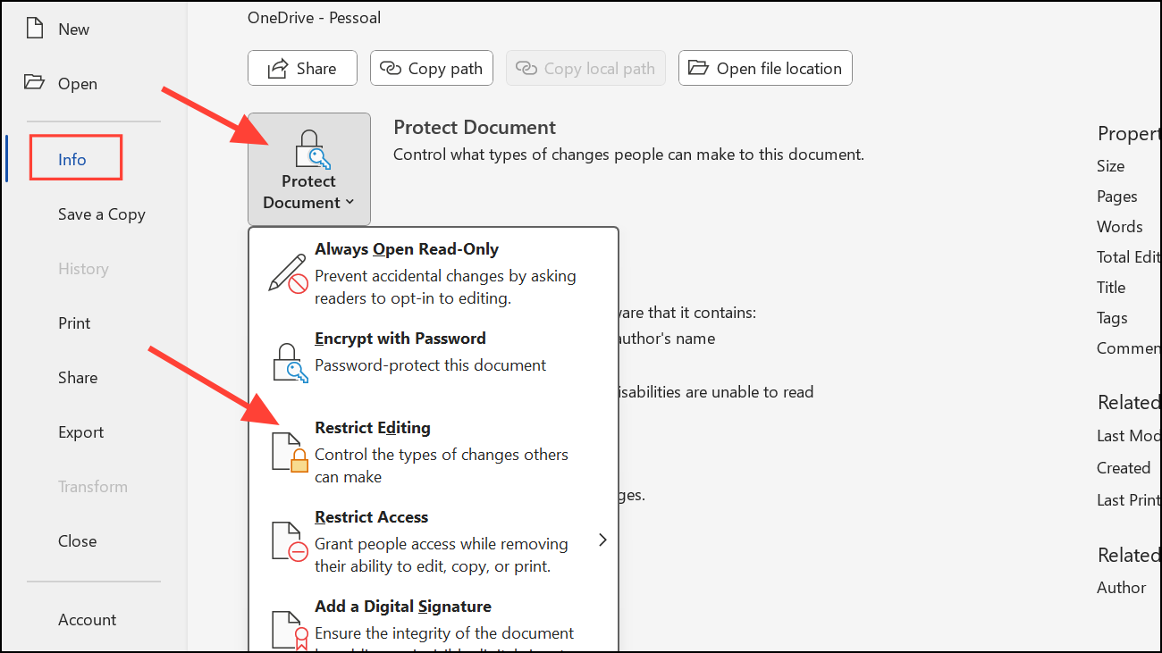Step 5: Click the File tab, select Info in the left pane, then click Protect Document and choose Restrict Editing. The Restrict Editing pane will appear on the right side of your Word window.