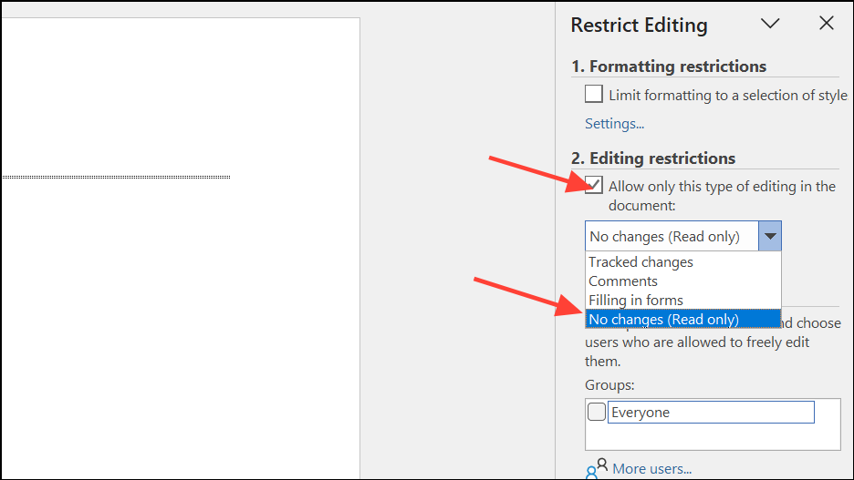 Step 6: In the Restrict Editing pane, check Allow only this type of editing in the document and select No changes (Read only) from the dropdown menu. This makes the document read-only by default.