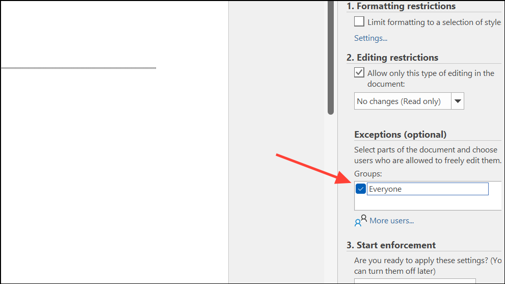 Step 8: Under the Exceptions section in the Restrict Editing pane, check the box for Everyone. This allows all users to edit the selected region, but not the header/footer area.