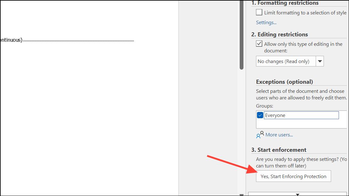 When your document contains multiple sections (for example, chapters or appendices), you can use section breaks to apply different headers/footers or protection levels to each section. Double-check that your protection settings apply only to the desired sections by reviewing the Restrict Editing pane and adjusting exceptions as needed.