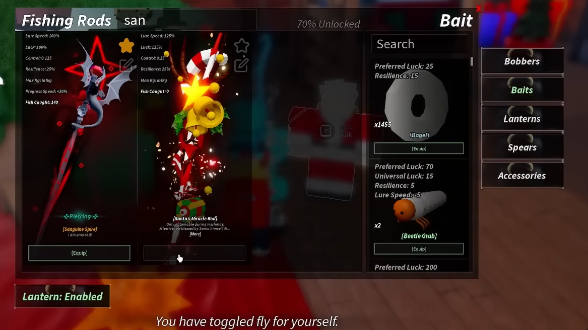 Step 1: Equip a Fischmas rod that has a festive mutation such as Merry, Gingerbread, Peppermint, or Festive. Santa’s miracle rod works well once you roll a festive mutation on it using a festive relic.