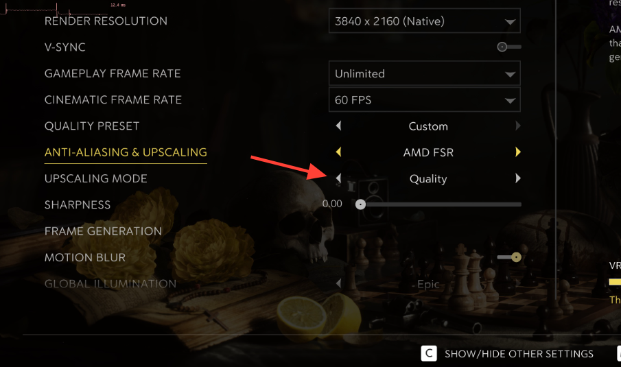 Lower Render Resolution one notch (e.g., to 75–80%). 2K suggests adjusting Render Resolution to reduce GPU load without heavily impacting clarity, particularly at 4K. This helps avoid mid‑scene hangs when new assets stream in. You’re on track if GPU utilization drops and areas that previously stuttered now maintain frame pacing.