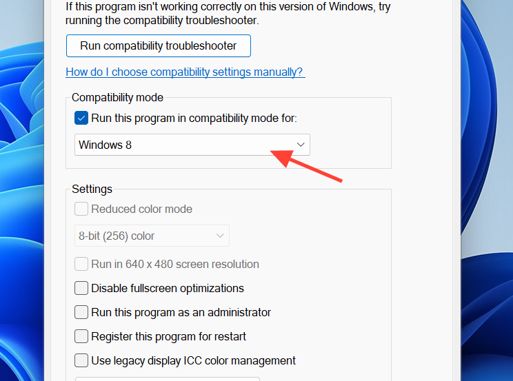 Set “Compatibility mode” to Windows 8. Some players saw frequent crashes drop to occasional or disappear with this mode. It can slightly reduce performance on some systems, but it’s useful when stability is the priority. You’re on track if Windows 8 is selected under Compatibility mode.