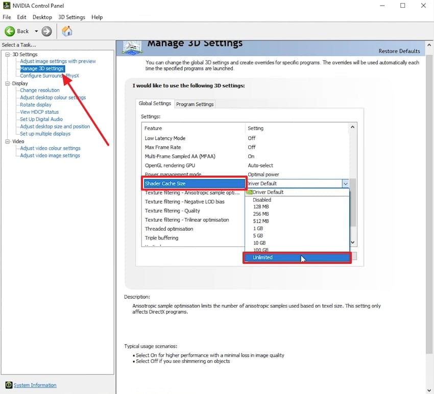 Set Shader Cache Size to “Unlimited” in NVIDIA Control Panel. Open the Control Panel > Manage 3D settings > Global, then change Shader Cache Size to Unlimited. This reduces shader re‑compiles across scenes and helps prevent stalls that can escalate into crashes. You’re on track if the setting persists after Apply and a quick reboot.