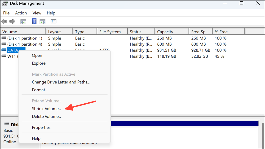 Step 2: Identify a partition with sufficient free space—commonly the C: drive. Right-click on it and choose Shrink Volume. Specify the amount of space to shrink in megabytes, ensuring you leave enough space for Windows to function smoothly. Click Shrink to create unallocated space.
