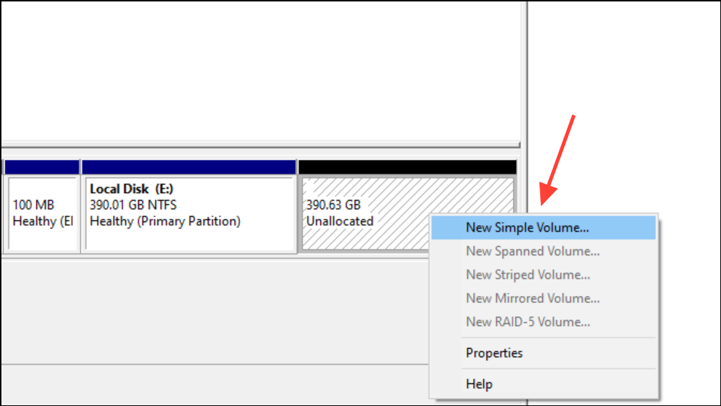 Step 3: Right-click the new unallocated space and select New Simple Volume. Follow the wizard prompts to assign a drive letter, set the volume size, and choose NTFS as the file system. Name the partition (for example, Shared), then complete the process by clicking Finish.