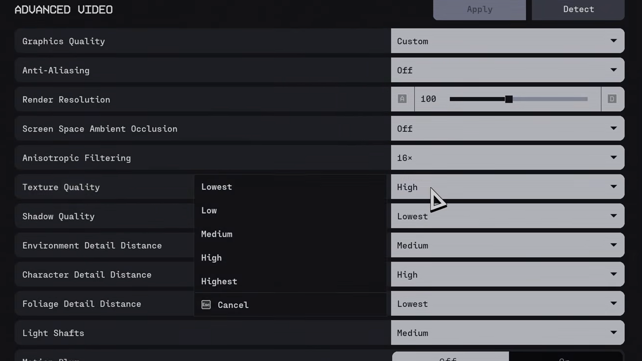 Foliage Detail Distance on Lowest does two jobs at once. It improves the average frame rate, and it reduces how much distant vegetation interferes with visibility. Character Detail Distance should stay on High so players remain easy to identify at longer ranges.