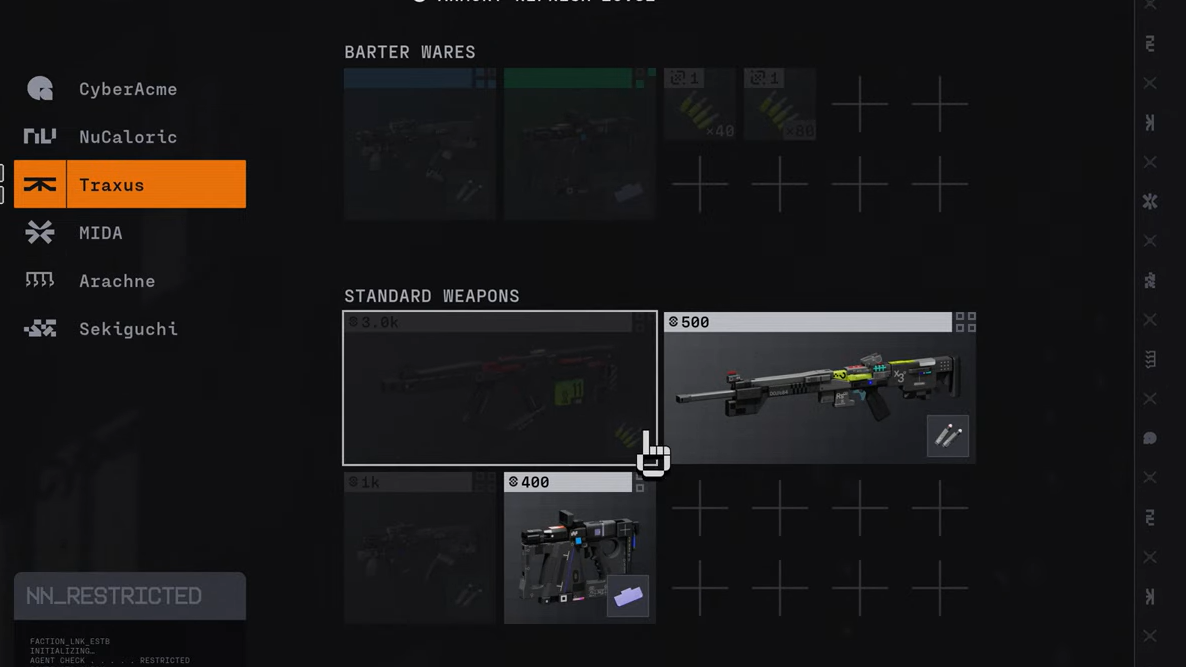 Traders live inside the armory section of your hub. To reach them, open your vault first, then navigate to the armory tab. Six traders are available, each stocking different categories of gear. You can buy weapons, ammunition, and medical supplies with credits, but the real value comes from their barter listings, which rotate and improve as you level up.