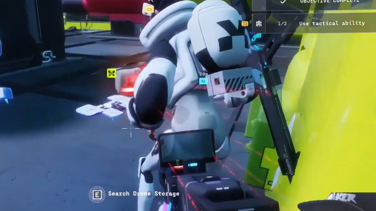When the drone flies close enough to another Runner, that player gets highlighted with a green outline. At that point, press the tether button to fire a hooked line toward them. A successful hit pulls the most valuable item from their inventory into the drone's storage. Each additional tether hit knocks loose another item, working down from highest to lowest value. The drone has eight loot slots, so a single target can lose multiple items if you land repeated hits.