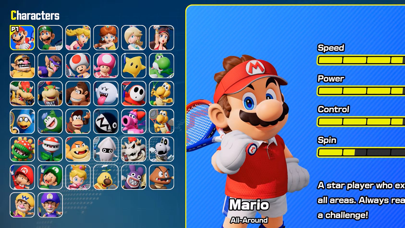 Mario Tennis Fever features 38 playable characters, the largest roster in series history. Six characters make their Mario Tennis debut: Nabbit, Goomba, Piranha Plant, Baby Luigi, Baby Wario, and Baby Waluigi — with Baby Waluigi appearing in a game for the very first time. Each character falls into one of six play types that influence their base stats: All-Around, Defensive, Powerful, Speedy, Technical, and Tricky.