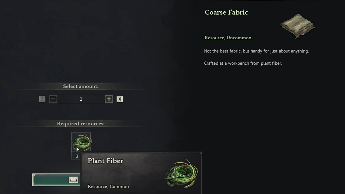 Total cost for a full base-tier set lands at 25 Coarse Fabric and 10 Rough Hide, both farmable from early-game animals and basic gathering.