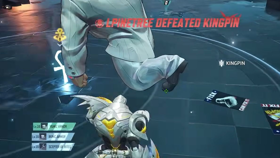 Kingpin is a high-health damage sponge rather than a mechanically complex fight. He has a short movelist, but two attacks matter. His Cane strike briefly immobilizes anyone it connects with, and his leaping AoE explosion deals heavy burst damage to anyone caught in the landing zone.