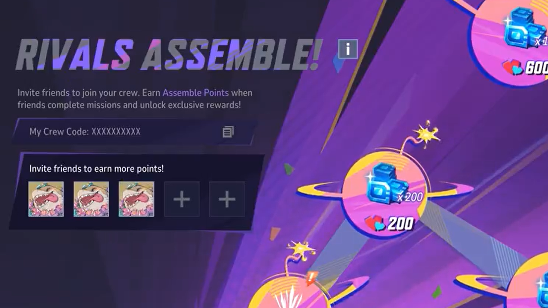 Rivals Assemble! is the social arm of the event. It sits on the Times Square hub as its own tab and revolves around assembling a small “crew” of other players and progressing a shared reward track.