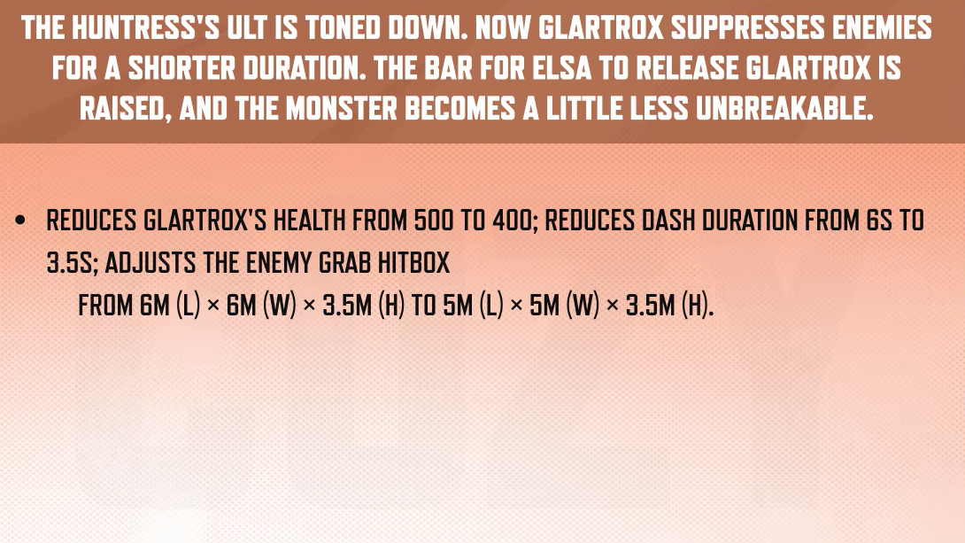 | Elsa Bloodstone | Duelist | Glartrox HP 500 → 400; dash duration 6s → 3.5s; grab hitbox 6×6×3.5m → 5×5×3.5m |
