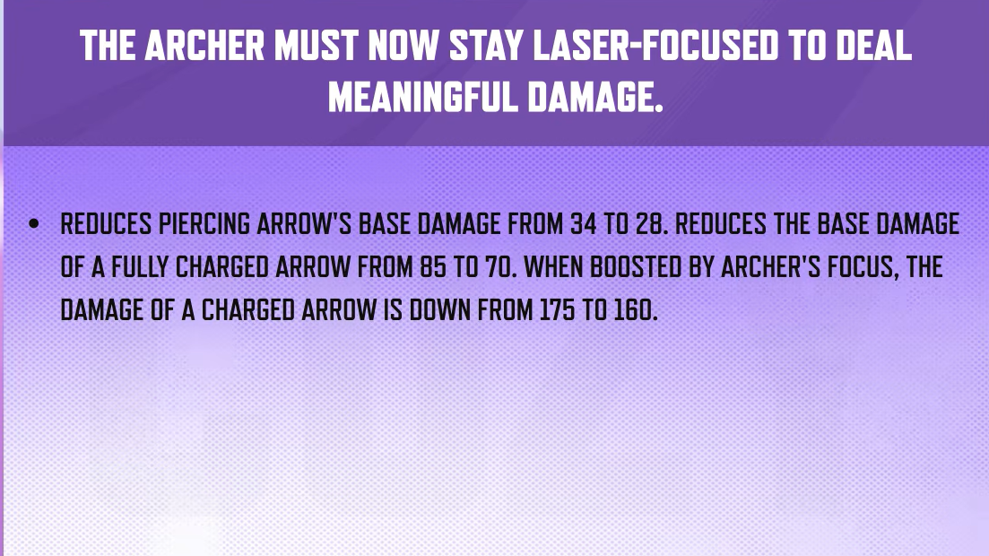 | Hawkeye | Duelist | Piercing Arrow base 34 → 28; full charge 85 → 70; Archer's Focus charged 175 → 160 |