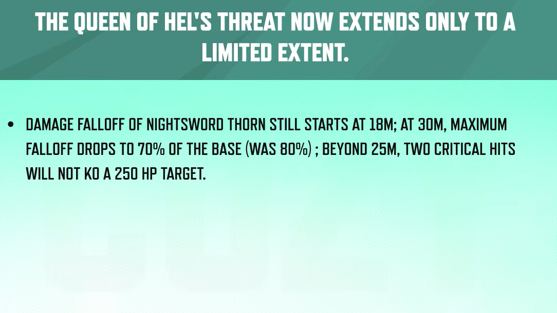 | Hela | Duelist | Nightsword Thorn max falloff at 30m: 80% → 70%; two crits beyond 25m no longer KO 250 HP targets |