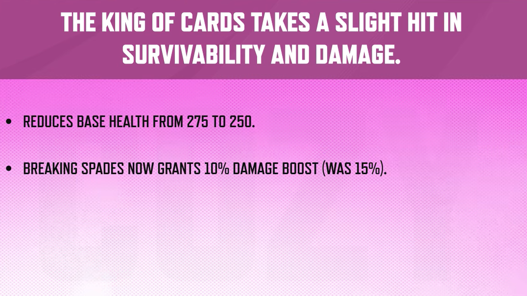 | Gambit | Strategist | Base HP 275 → 250; Breaking Spades damage boost 15% → 10% |