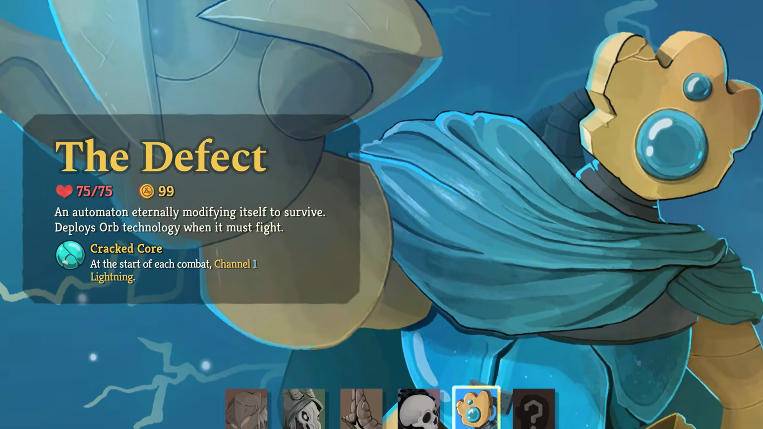 The Defect begins every run with the Cracked Core relic, which automatically Channels one Lightning Orb at the start of each combat. This gives you a small passive damage tick from turn one and sets the tone for the character's central mechanic: Channeling elemental Orbs into slots, where they provide end-of-turn effects, and Evoking them (pushing them out) to trigger a stronger one-time burst.