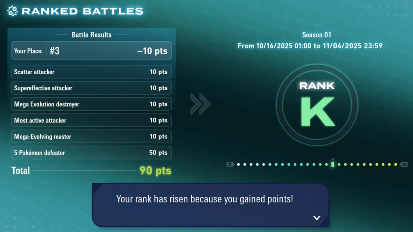 Reaching Rank K on the Season 1 Ranked ladder grants Greninjite, the Mega Stone that enables Mega Greninja in battle. The Ranked path is the only route for this item at launch. If Ranked isn’t your usual mode, the point system’s placement and action-based scoring lowers the pressure: it rewards frequent play and competent turns more than flawless streaks.