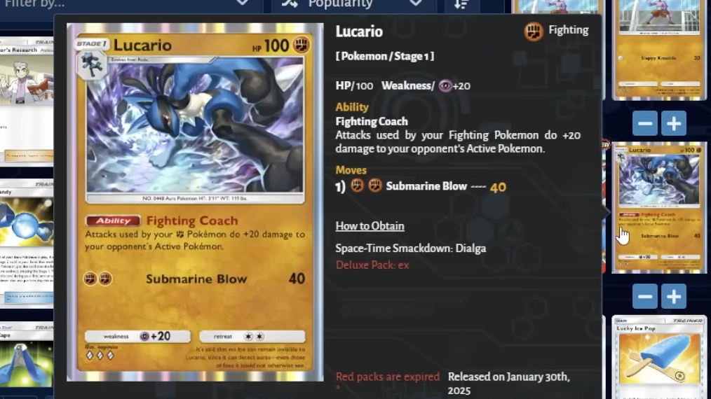 If you cannot pull a second Mega Lucario ex right away, the deck still functions with one copy as long as you keep Lucky Ice Pop and Pokémon Center Lady in to extend its life. Trading with friends remains the fastest way to fill in the missing two-of slots like Korrina and Riolu.