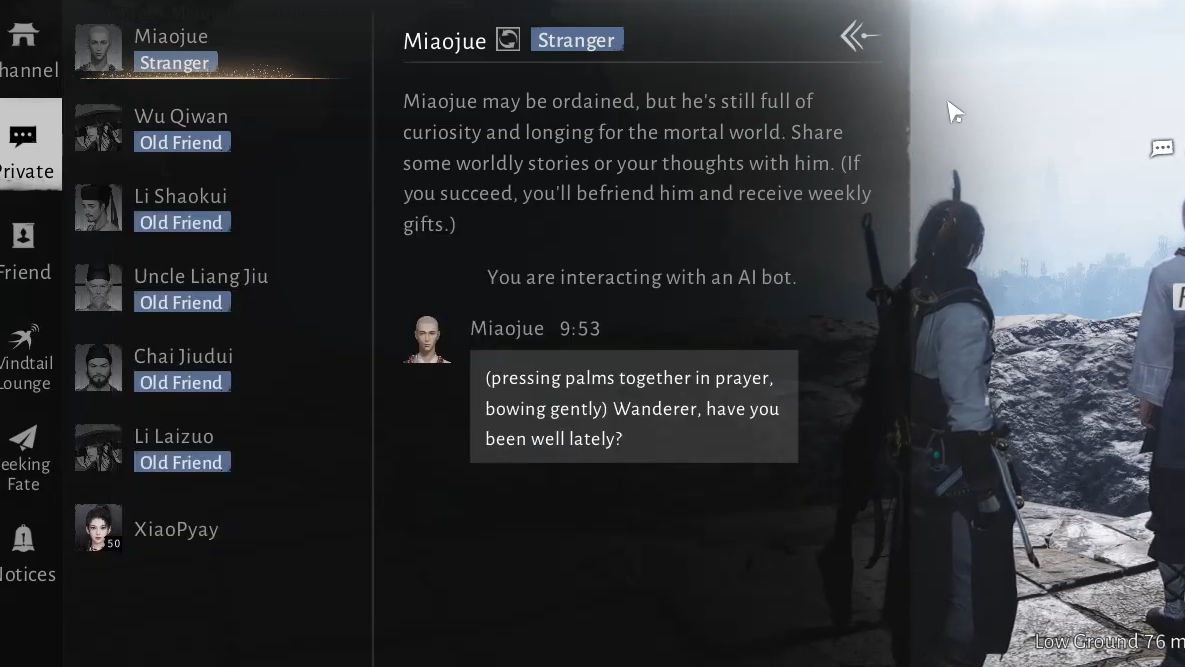 Miaojue is a Jianghu Friend NPC, a special category of characters that can be befriended to earn ongoing rewards once their attitude reaches Revered. Jianghu Friends are written to flesh out the world and its factions, but a subset of them, including Miaojue, use AI Chat instead of fixed dialogue trees.