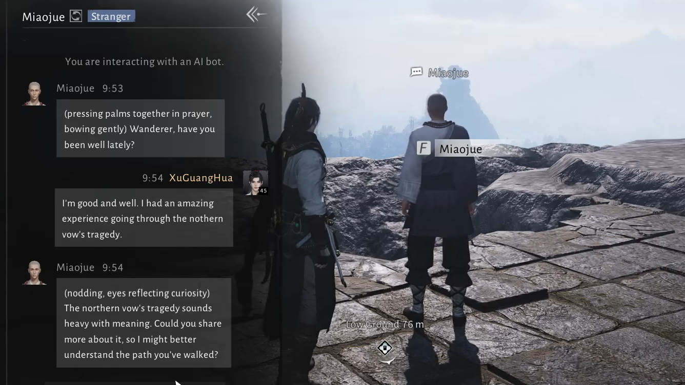 Step 1: In rare cases, AI Chat NPCs can become hostile mid-conversation if they interpret your lines as disrespectful or threatening. If Miaojue suddenly attacks, open the menu and return to the login screen instead of fighting to the end.