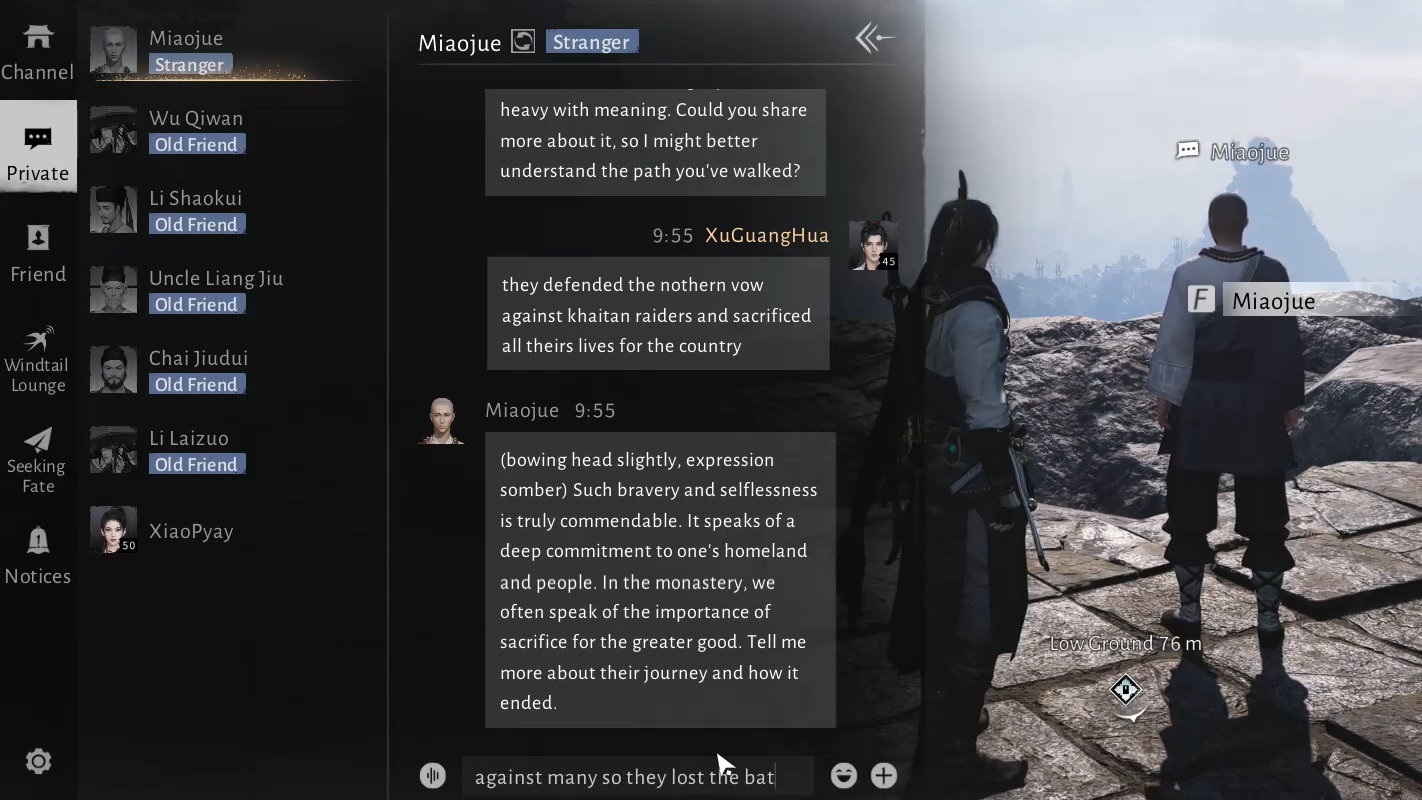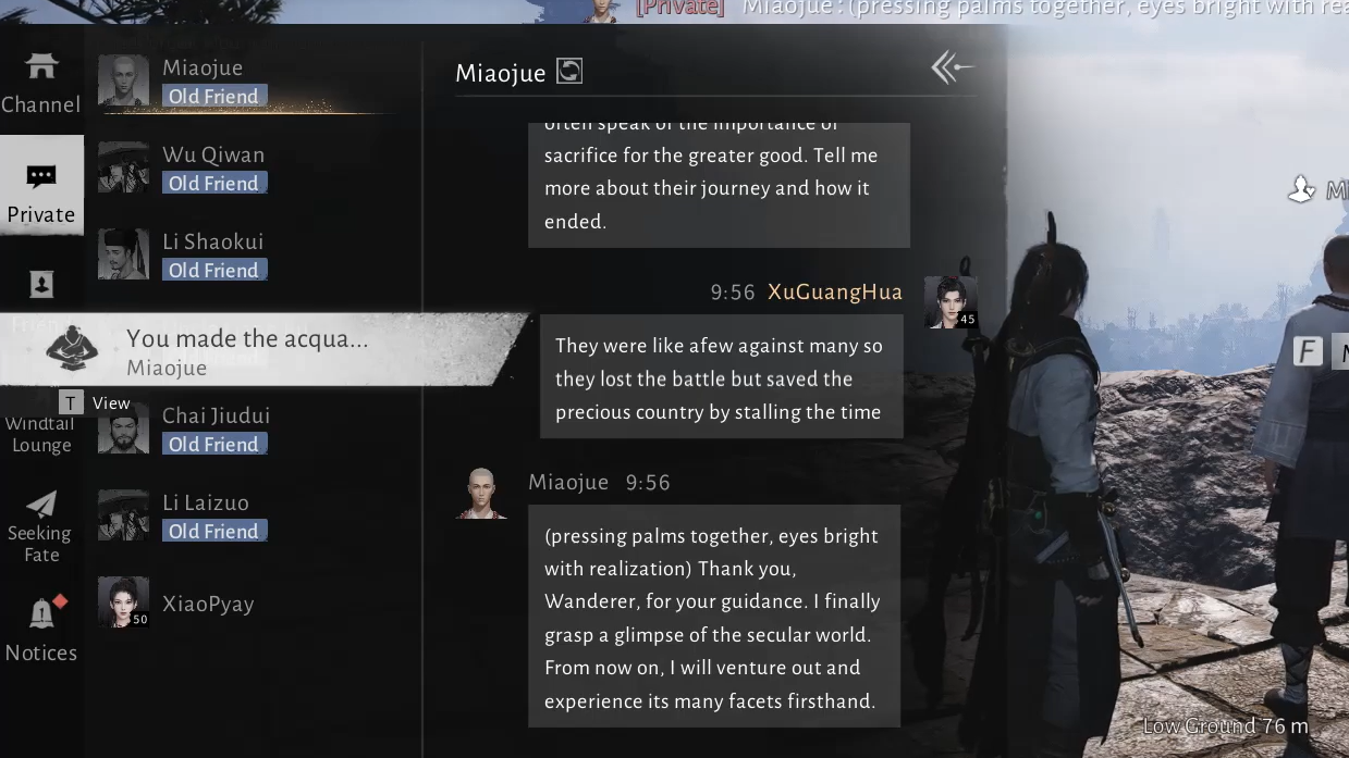 Approaching Miaojue as a listener and storyteller, rather than a puzzle to brute force, lines up with his role in the game. Treat him like any other wanderer of the Jianghu: share what you’ve seen, explain what you’ve learned, and give him space to decide that you are worth calling a friend.
