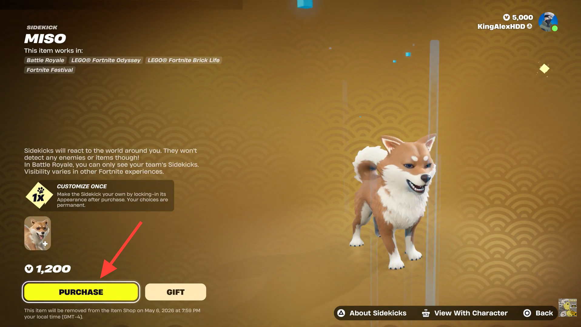 Miso is part of the Shinobi Shiba set and appears in the Golden Week section of the item shop. The base price is 1,200 V-Bucks. The sidekick is not free in the shop, despite some viral framing online. The "free" angle refers to the unlockable styles and cosmetics that come with the sidekick at no extra cost once you complete its quest stages.