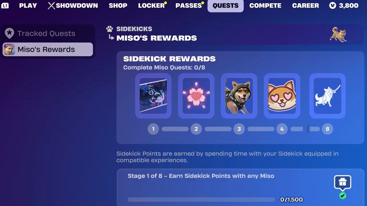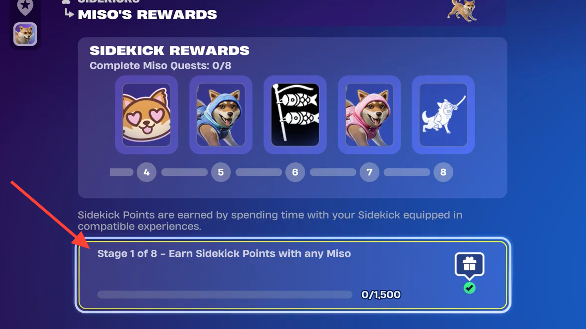 Step 3: Open the Quests tab, select Sidekicks, then Miso's Rewards. Confirm Stage 1 of 8 reads "Earn Sidekick Points with any Miso" with a 0/1,500 progress bar before queueing into a match.