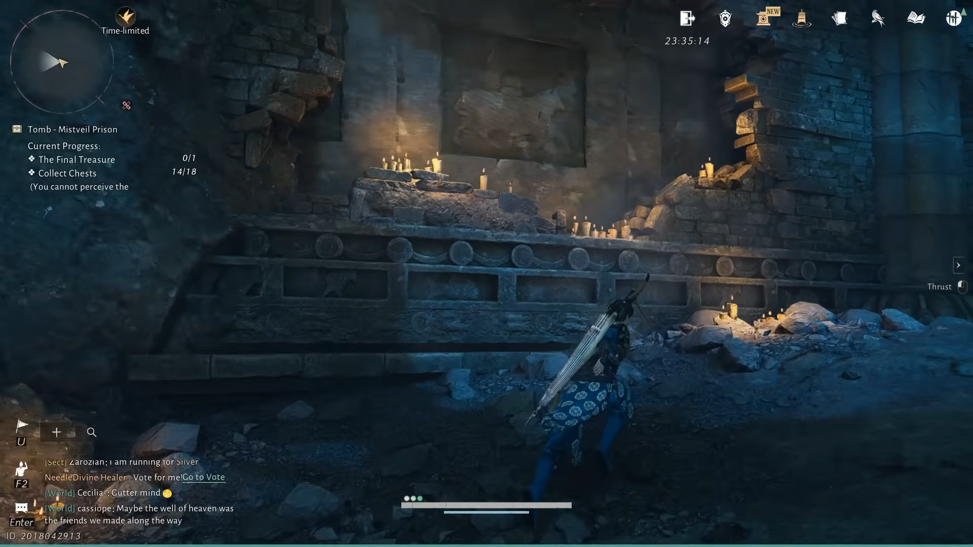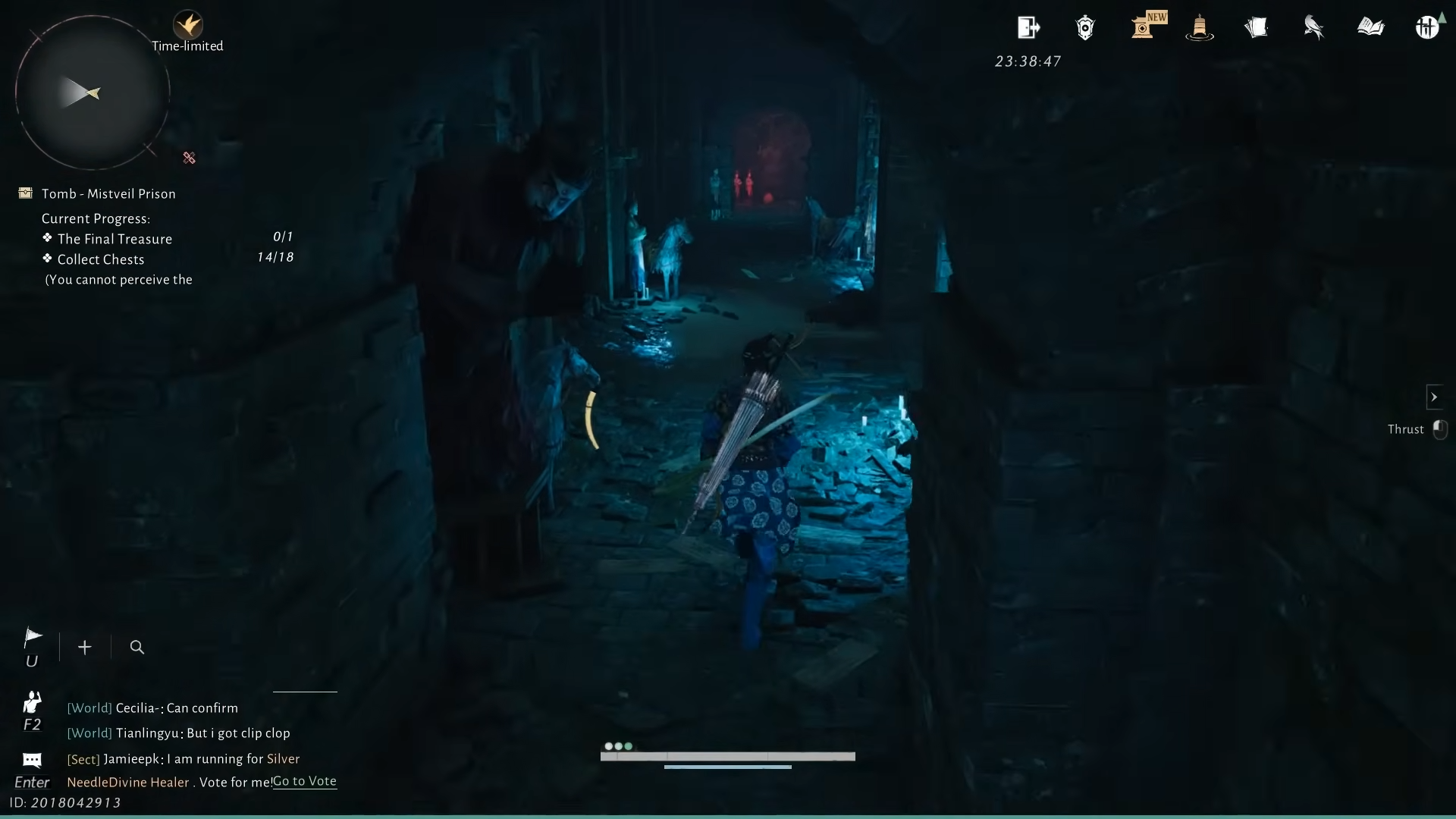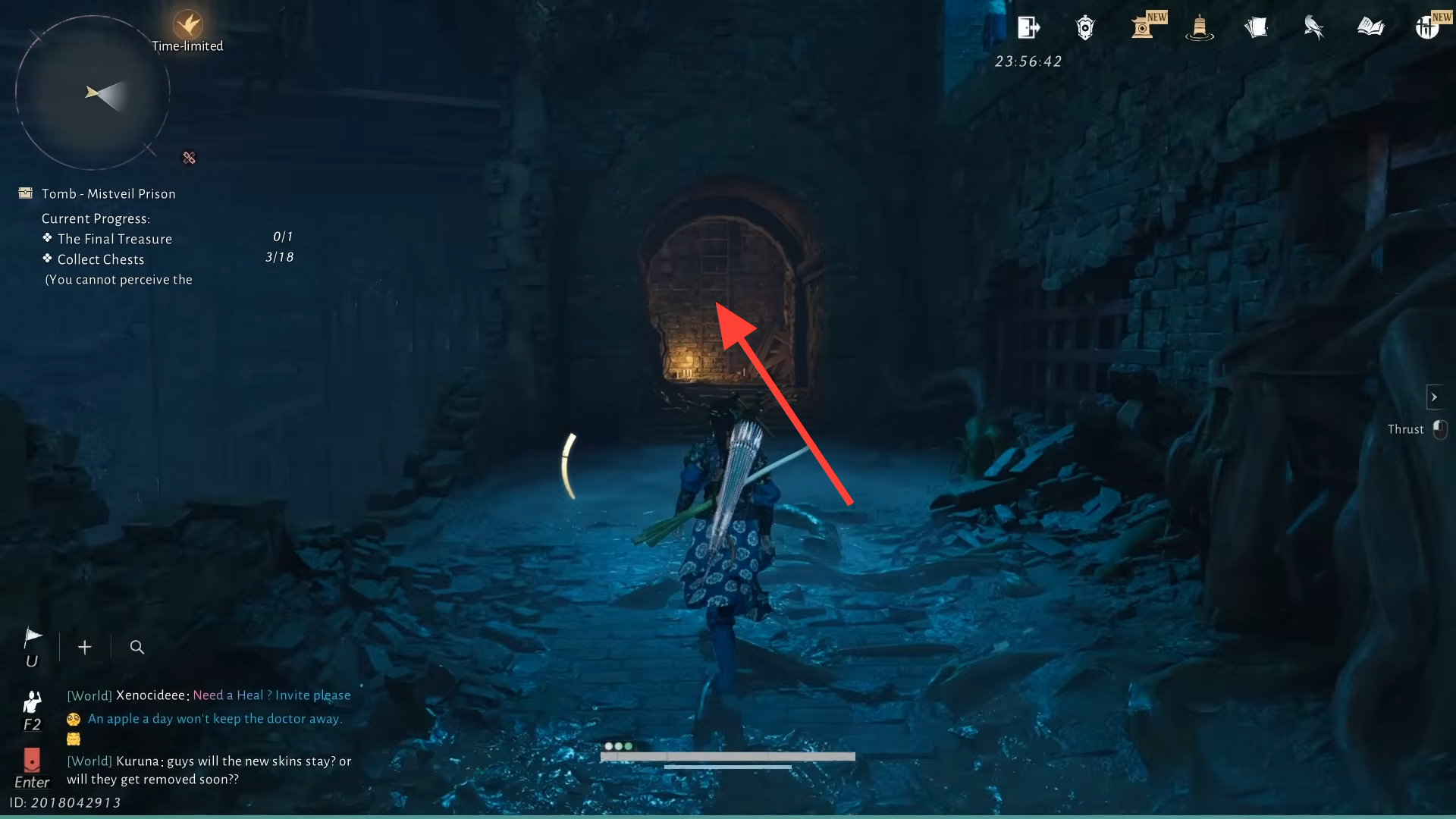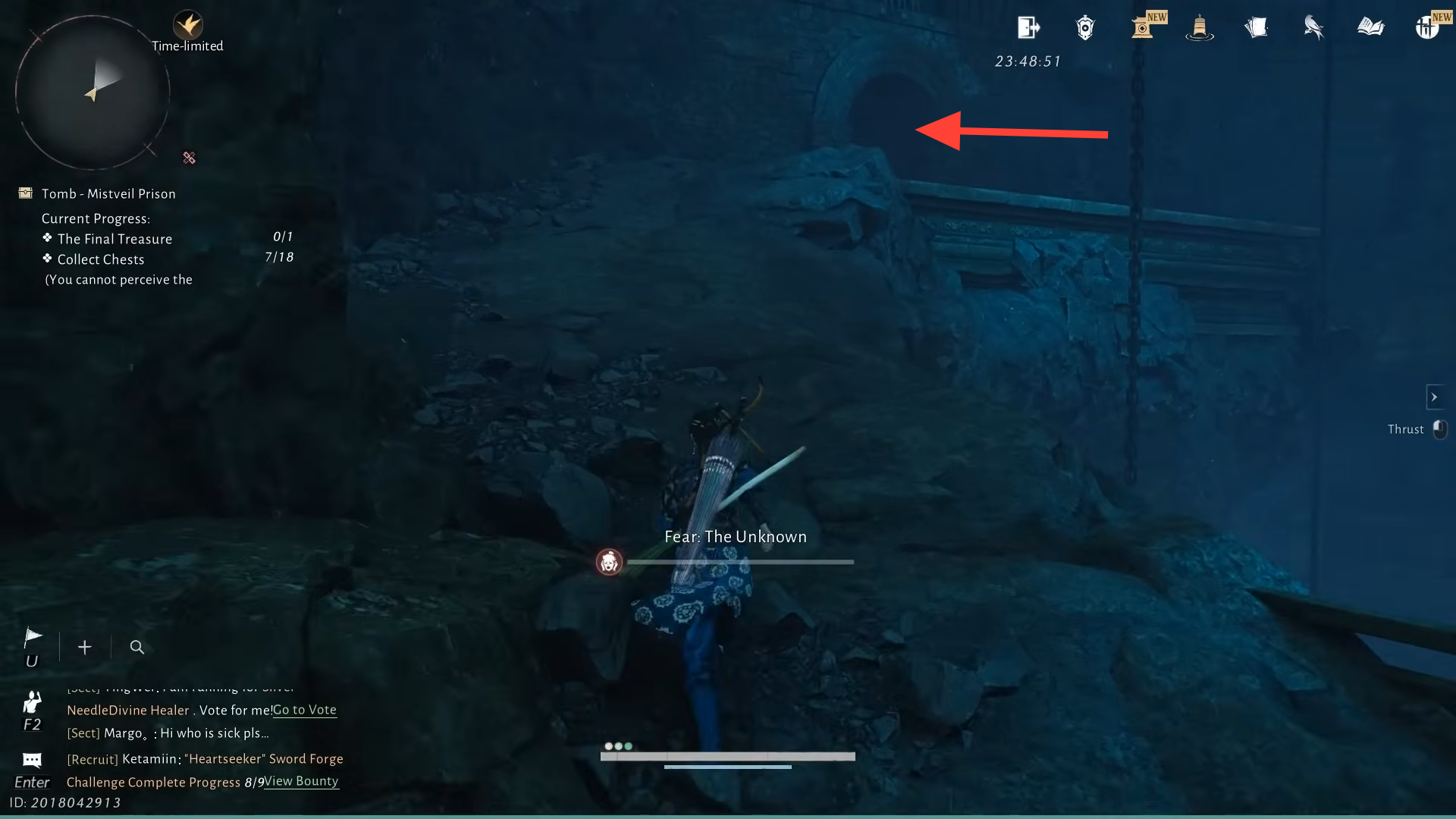 Step 4: Leave the cell to the right. In the next room, several men kneel before an altar. The front-most NPC, The Thinker, mutters about a “narrow crevice” and searching for a way out “over and over again.” Looking through a hole in the wall shows a glowing golden treasure chest that looks like the final reward, but interacting with it makes it vanish. The far end of that room is sealed, marking this as a deliberate fake-out.
