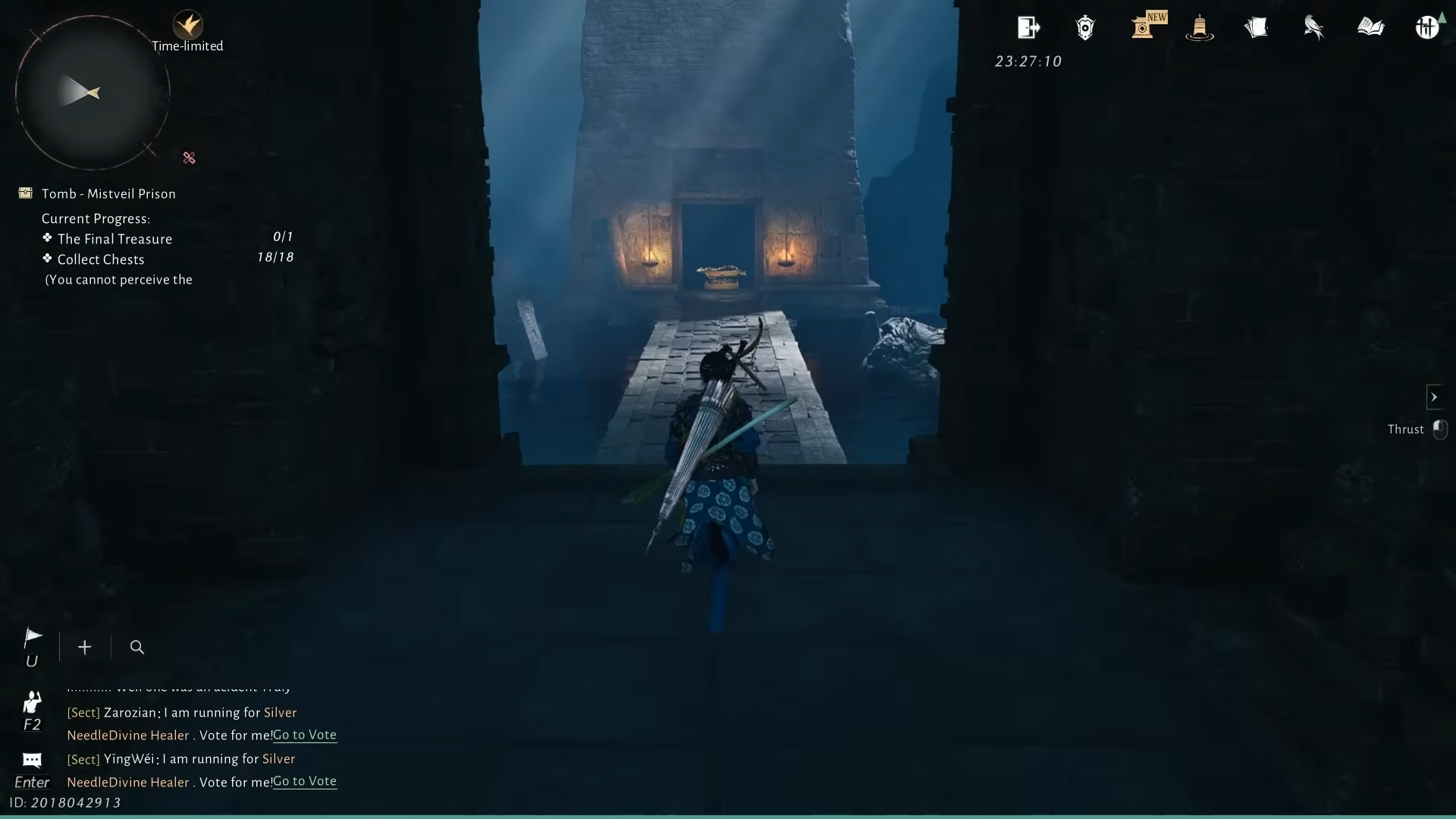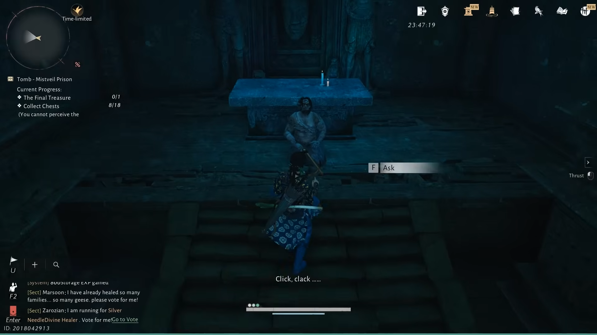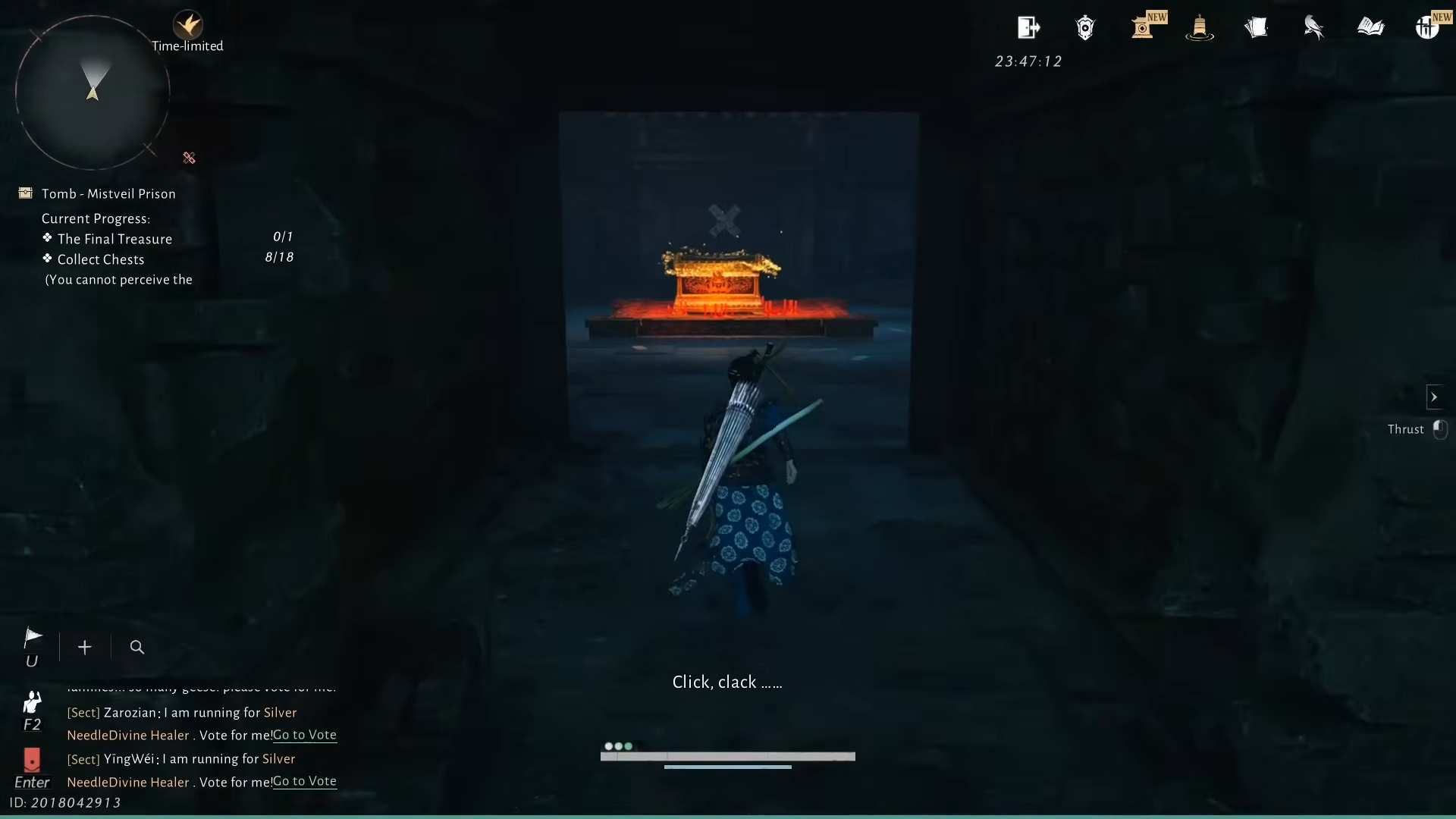 Step 4: Leave the cell to the right. In the next room, several men kneel before an altar. The front-most NPC, The Thinker, mutters about a “narrow crevice” and searching for a way out “over and over again.” Looking through a hole in the wall shows a glowing golden treasure chest that looks like the final reward, but interacting with it makes it vanish. The far end of that room is sealed, marking this as a deliberate fake-out.