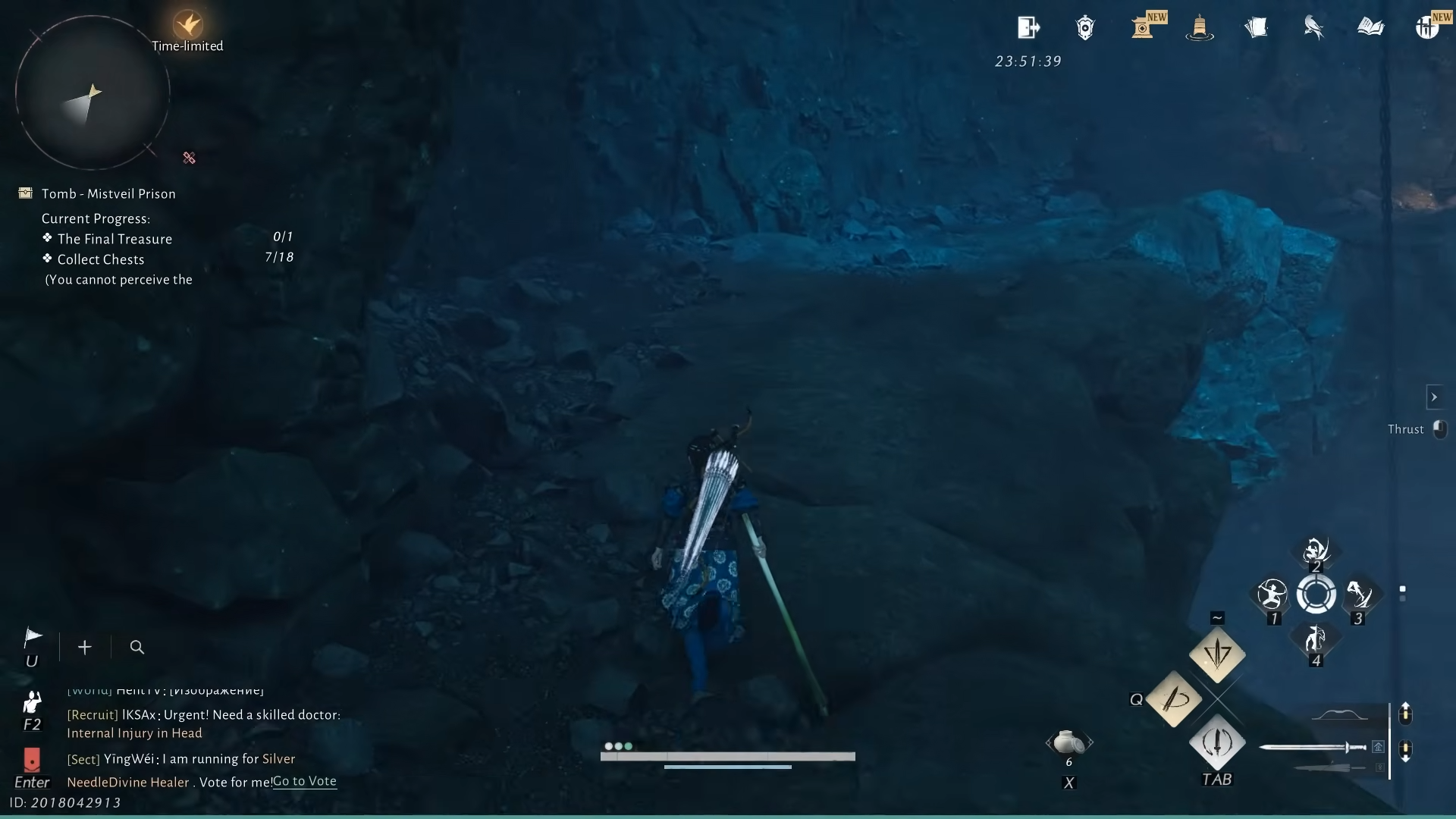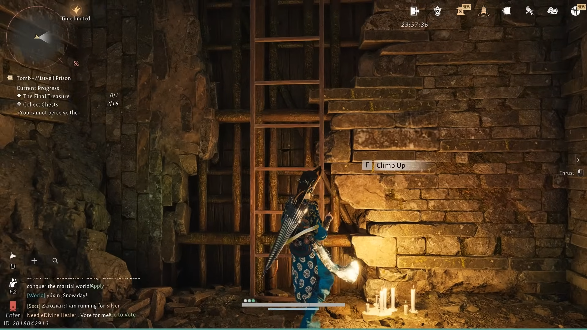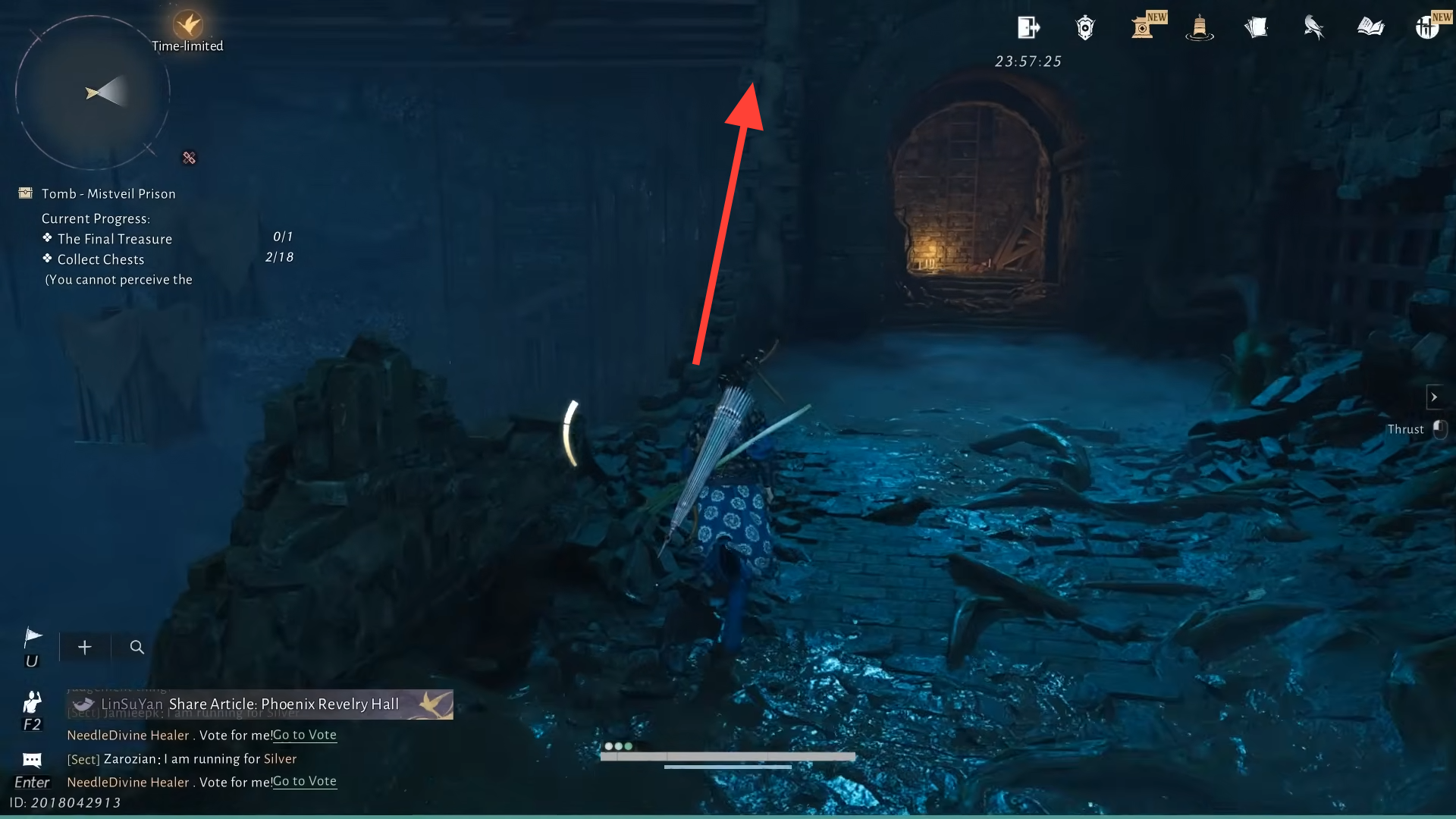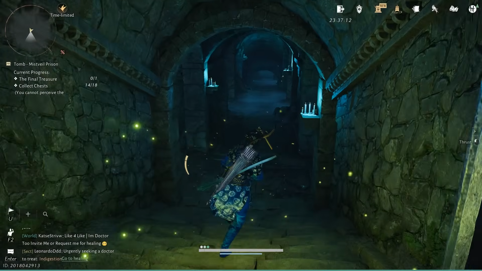 Step 4: Leave the cell to the right. In the next room, several men kneel before an altar. The front-most NPC, The Thinker, mutters about a “narrow crevice” and searching for a way out “over and over again.” Looking through a hole in the wall shows a glowing golden treasure chest that looks like the final reward, but interacting with it makes it vanish. The far end of that room is sealed, marking this as a deliberate fake-out.